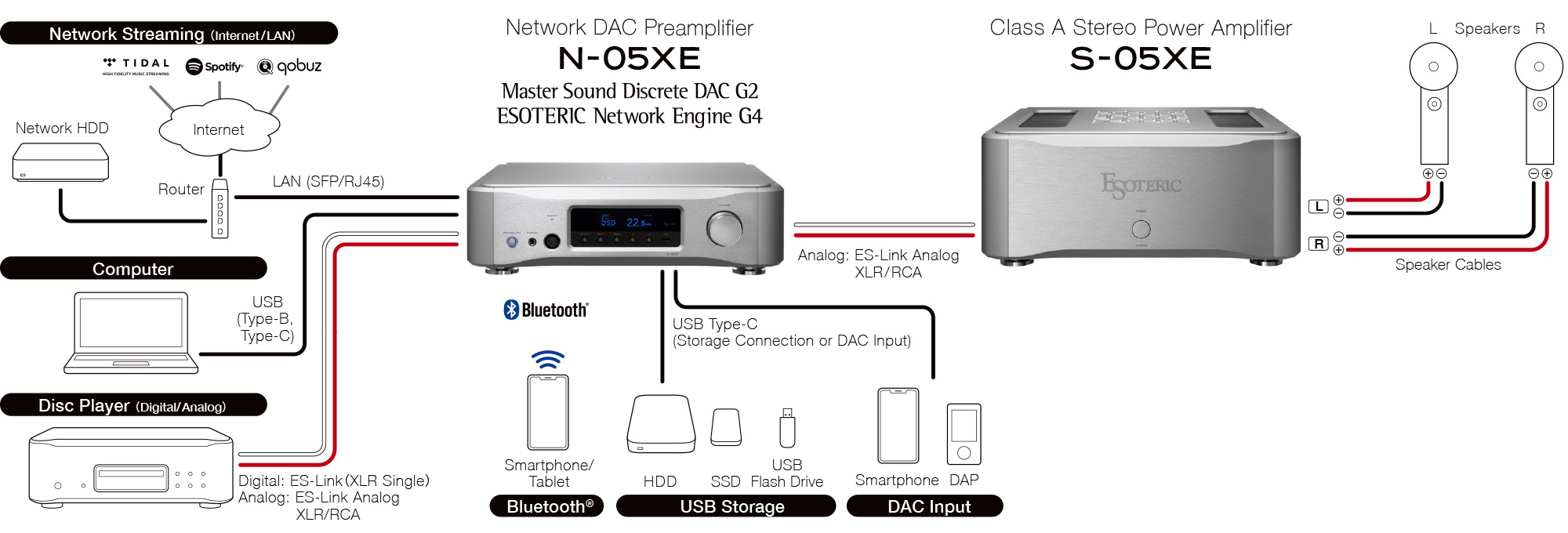 Uzupełnij swój system high-end o zaledwie dwa komponenty: S-05XE i przedwzmacniacz sieciowy DAC N-05XE. Wystarczy wybrać głośniki dopasowane do Twojego gustu. Ciesz się wyrafinowanym i luksusowym życiem muzycznym, wolnym od skomplikowanych rozwiązań sprzętowych, a jednocześnie zachwycającym dźwiękiem dostarczanym przez analogowe złącze ES-Link.