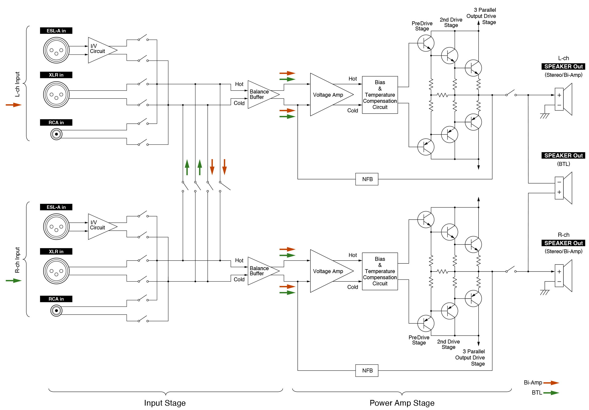 Gdy wymagana jest większa moc wyjściowa, na przykład w przypadku głośników o niskiej efektywności, zaleca się użycie dwóch jednostek S-05XE w trybie BTL. W tej konfiguracji dwa wewnętrzne bloki wzmacniacza są zmostkowane, aby dostarczyć 120 W przy 8 Ω jako system monoblokowy o dużej mocy. Zrównoważony napęd zapewnia solidną kontrolę i mocny chwyt nad głośnikami. - Tryb Bi-Amp